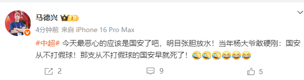 著名记者马德兴表示,“今天最恶心的应该是国安了吧,!当年杨大爷敢硬刚:国安从不打假球!那支从不打假球的国安早就死了!”